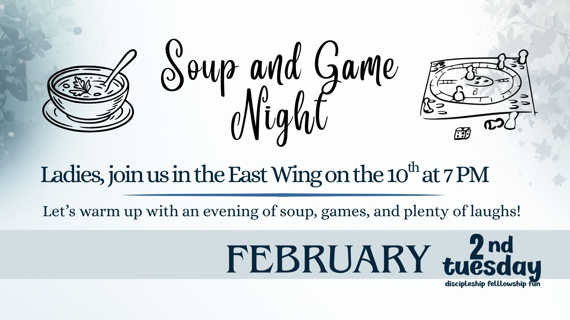 Ladies, join us on Tuesday, February 10th at 7 pm in the East Wing for a relaxed evening of soup, games, and plenty of laughter! If you have a favorite group game, feel free to bring it along! We’re looking forward to enjoying time together, sharing laughter, and building community. Contact Women’s Ministry for more information.